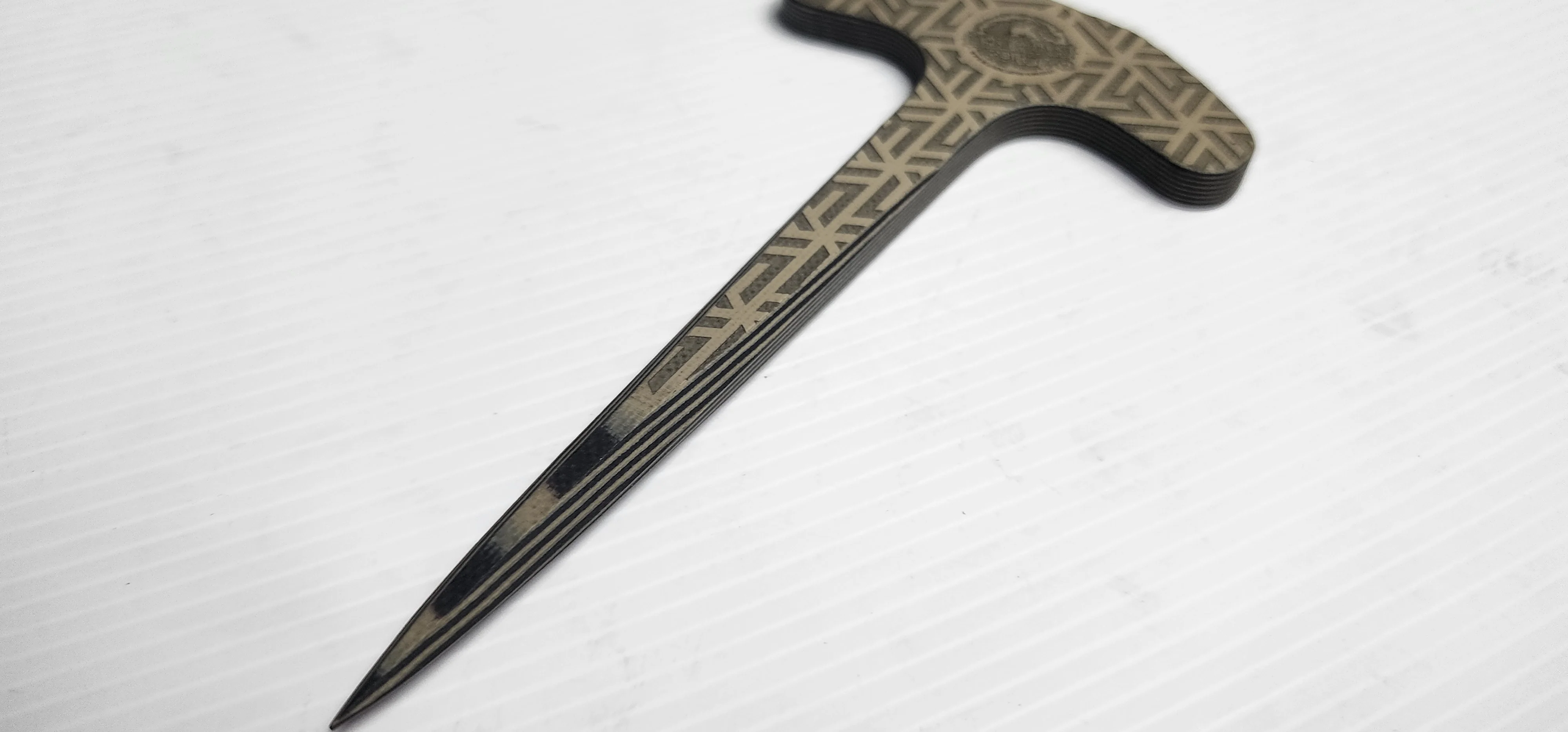 Introducing "The Shiv" – a formidable self-defense push dagger designed by ABS Mastersmith Neels van den Berg. Crafted from a blend of resilient black and white / tan G10 composite material, this lightweight yet exceptionally durable tool is designed to empower you with unwavering protection. Adorned with a unique custom pattern engraved on both sides, "The Shiv" is a truly unique little tool. Manufactured by the skilled artisans of Black Dragon Forge, each purchase contributes to their sustenance. Elevate your personal safety with "The Shiv" while supporting the artistry that brings it to life!
