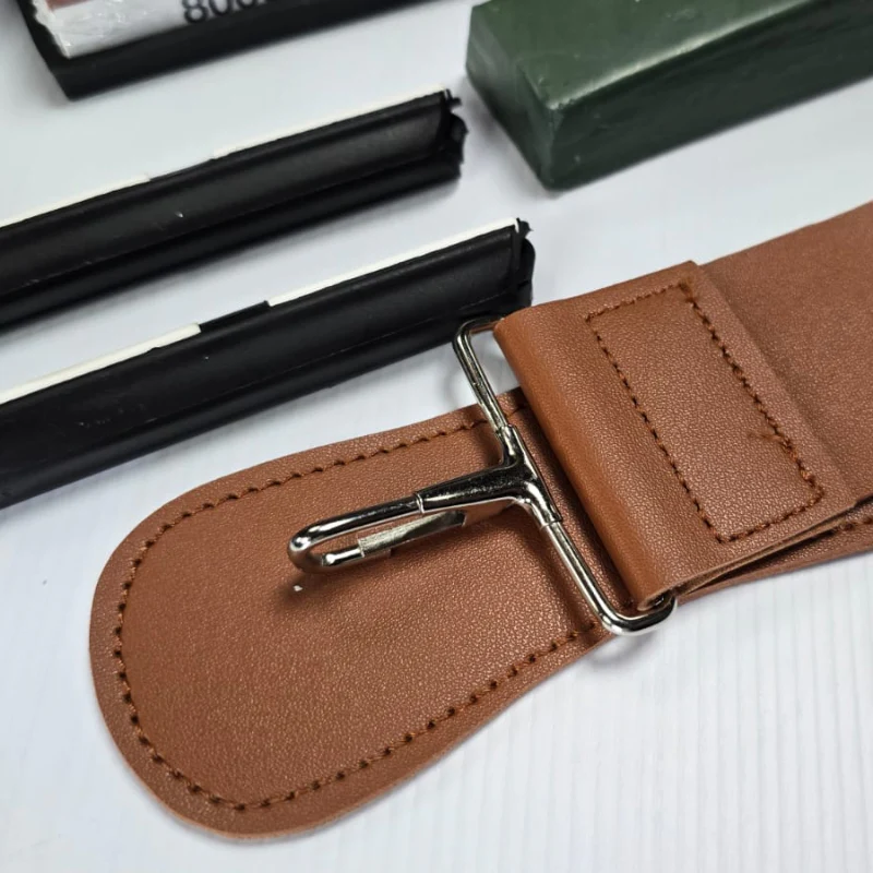 - 1 x Synthetic Leather Strop – Used after sharpening to remove burrs and create a smooth edge finish.